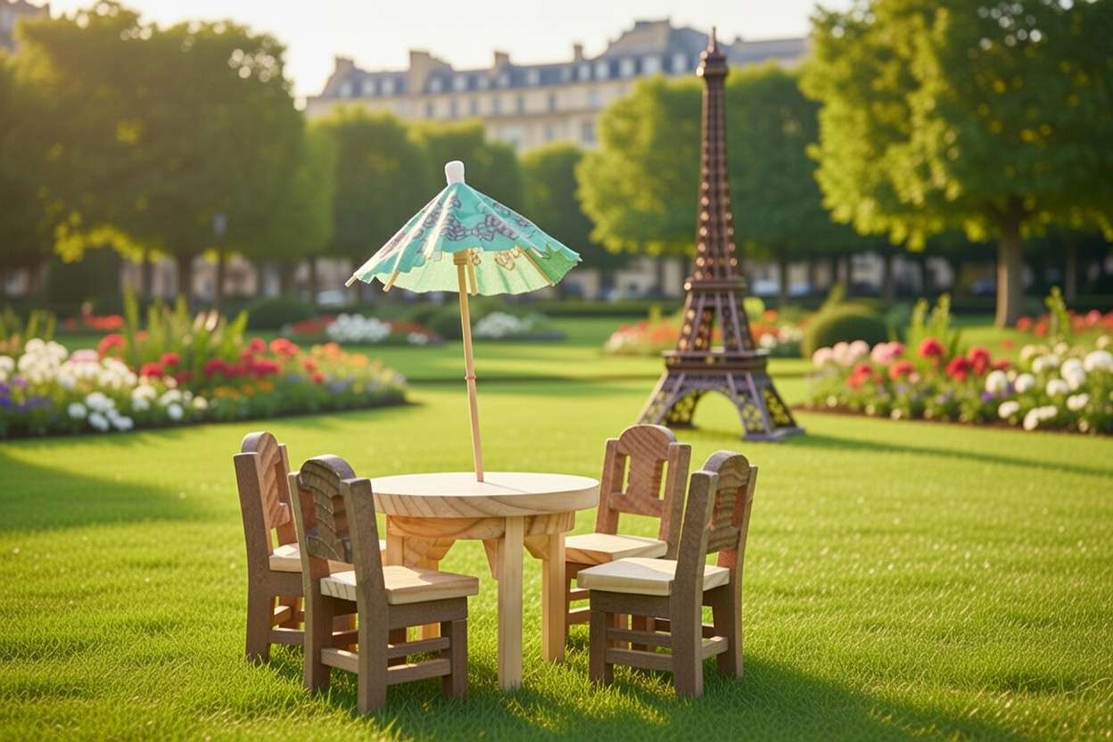 Bring a touch of European cafe culture to your playroom or shelf with the Bommakada Miniature Wooden Garden Cafe Set. This meticulously detailed collection includes four artisanal wooden chairs and a matching round table complete with a delicate green paper sunshade. The set is accompanied by a rustic wooden cottage and a bronze-finished Eiffel Tower miniature, creating a complete "Parisian Garden" scene. Whether you are looking to furnish a dollhouse or seeking a unique gift for a miniature enthusiast, this set offers timeless handcrafted appeal and encourages imaginative storytelling