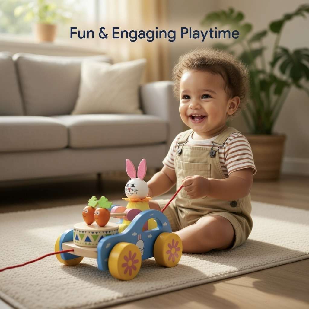 Cute wooden bunny pull toy with removable carrots & veggies on a fun cart, bright wheels, and easy-pull string — perfect for babies learning to crawl, walk, and explore!