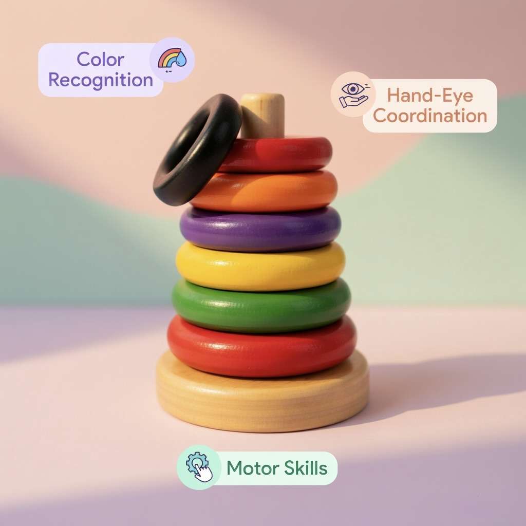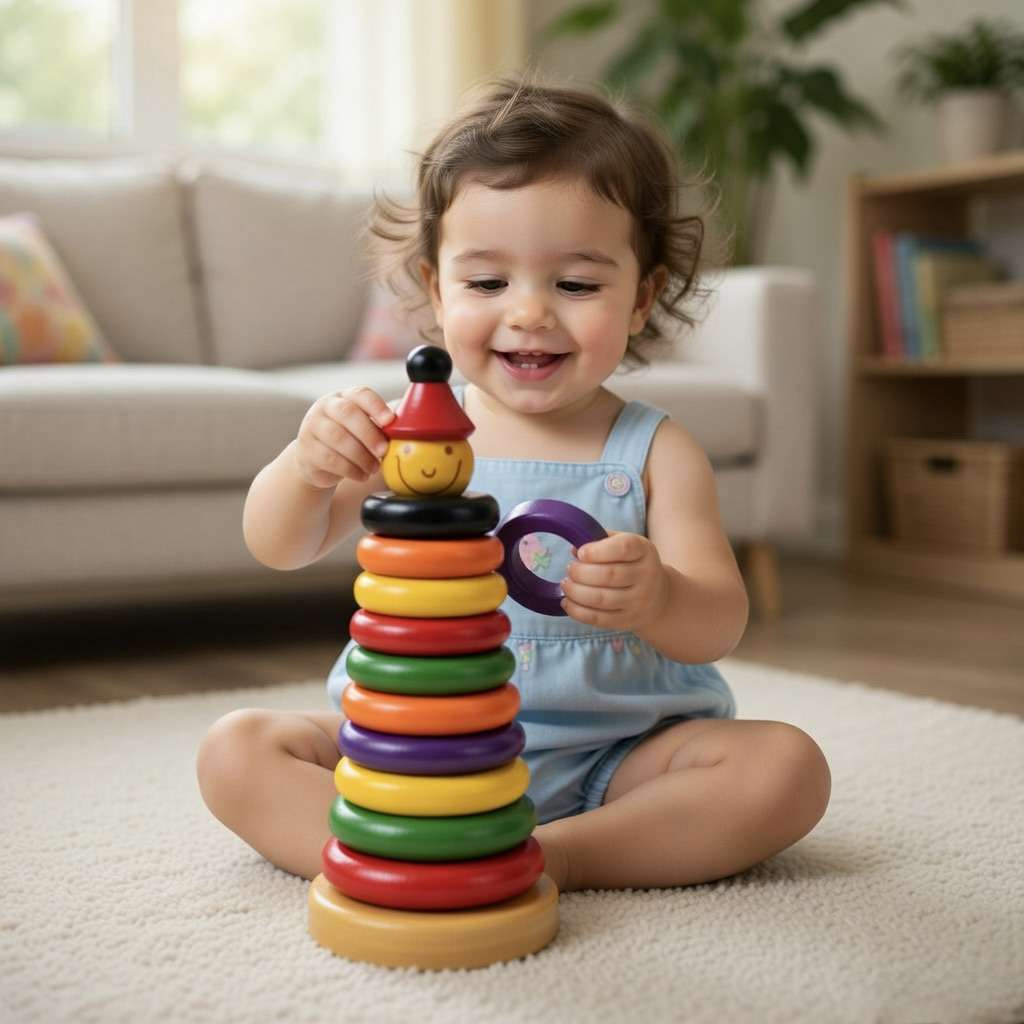 Colorful wooden stacking ring tower with happy clown face topper, rainbow rings and stable base — perfect for babies and toddlers to stack, balance and play!
