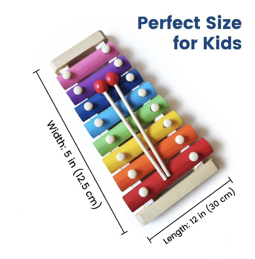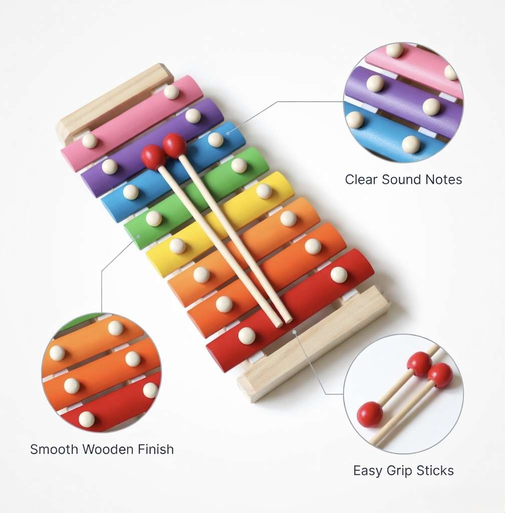 Introduce your child to the joy of music with this vibrant wooden xylophone! Features 8 precisely tuned metal bars in a beautiful rainbow sequence (red, orange, yellow, green, blue, purple, pink, and more), mounted on a natural wood frame with smooth rounded edges. Comes with two lightweight wooden mallets topped with red balls for easy grip and clear tone production. Made from high-quality natural wood and safe, non-toxic paints — durable, lightweight, and perfect for small children to hold and play. Tapping the bars creates cheerful, melodic sounds while the bright colors encourage visual learning and coordination. Ideal for sensory play, rhythm development, early music education, and creative expression. A timeless, eco-friendly musical toy that brings endless fun to toddlers and preschoolers!