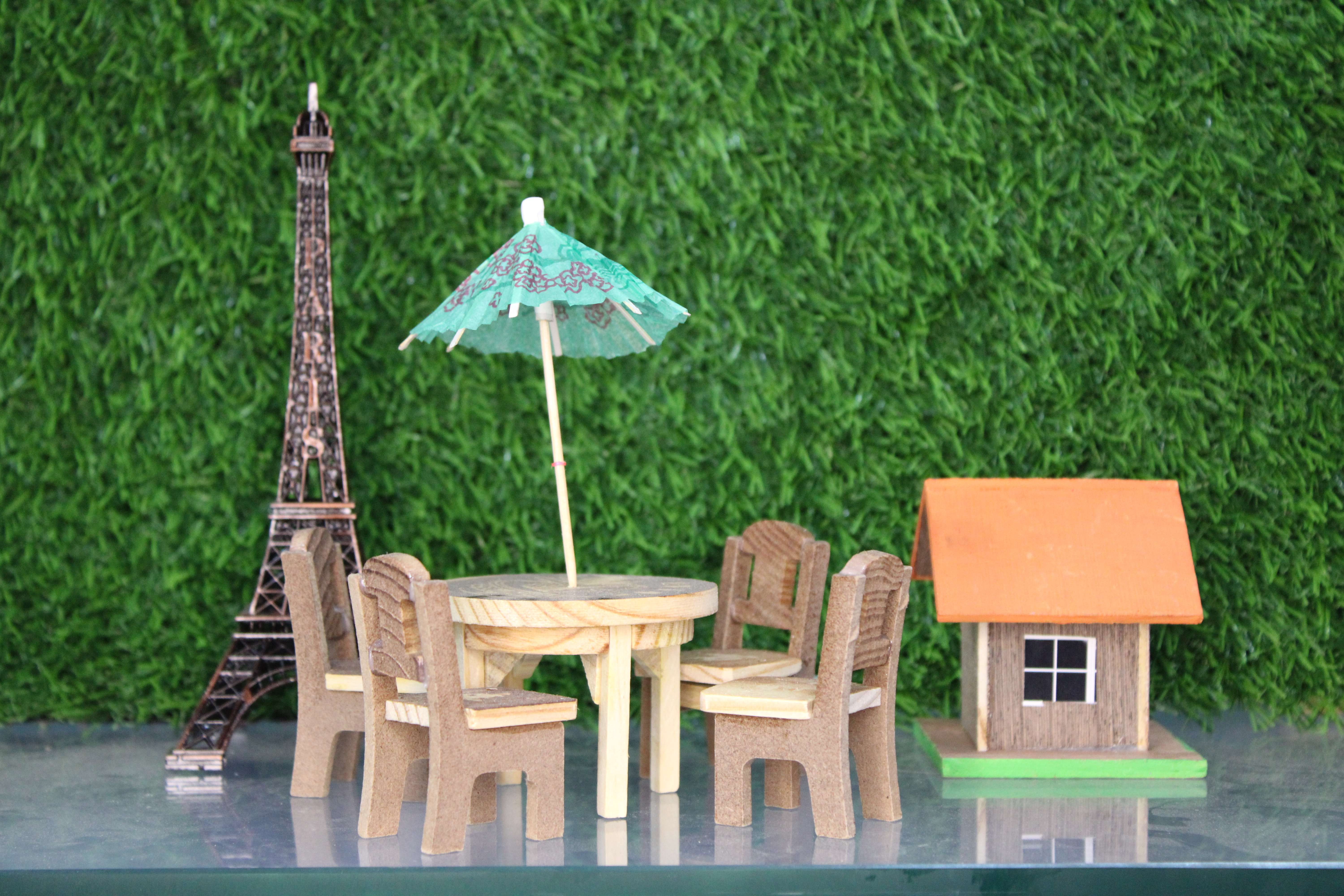 Bring a touch of European cafe culture to your playroom or shelf with the Bommakada Miniature Wooden Garden Cafe Set. This meticulously detailed collection includes four artisanal wooden chairs and a matching round table complete with a delicate green paper sunshade. The set is accompanied by a rustic wooden cottage and a bronze-finished Eiffel Tower miniature, creating a complete "Parisian Garden" scene. Whether you are looking to furnish a dollhouse or seeking a unique gift for a miniature enthusiast, this set offers timeless handcrafted appeal and encourages imaginative storytelling