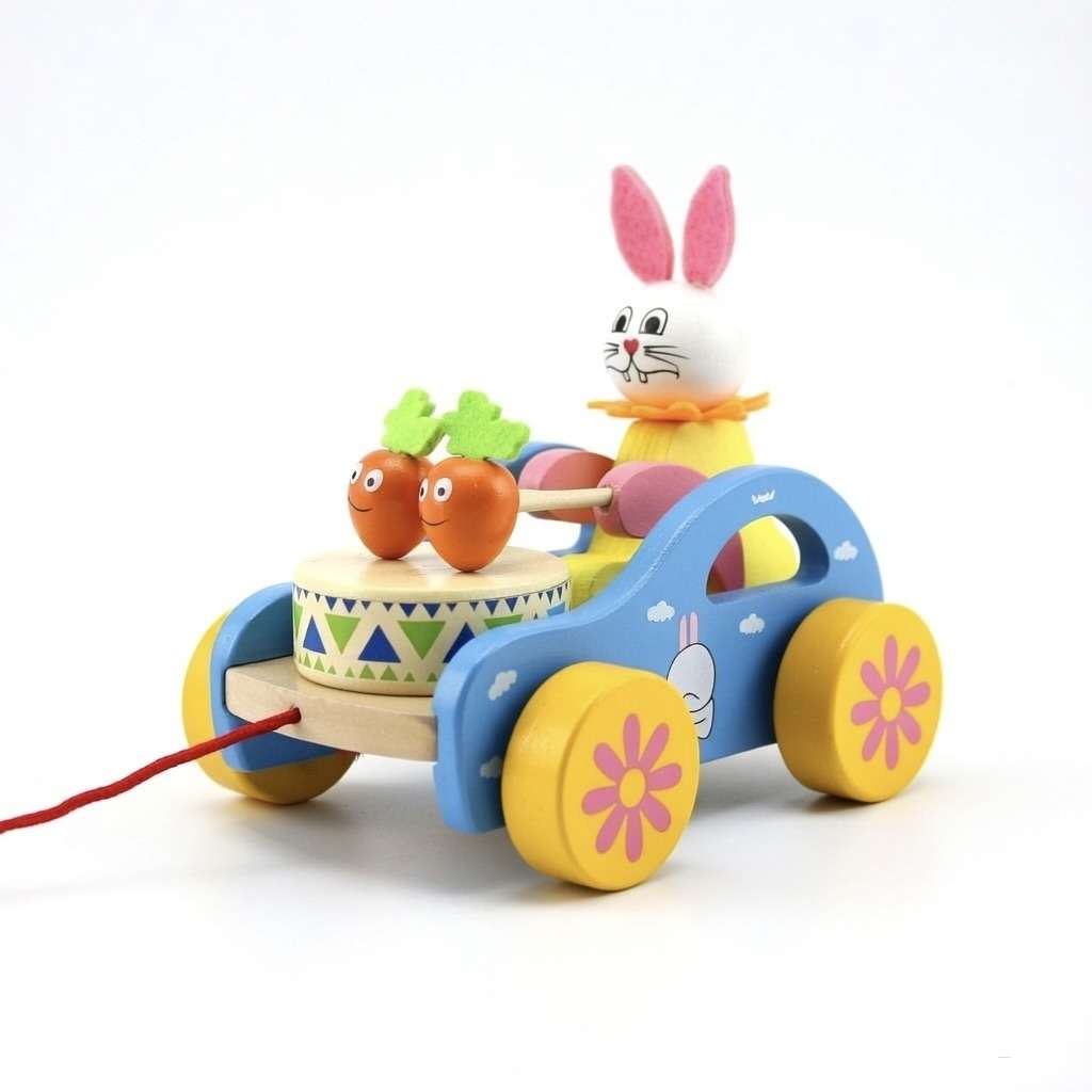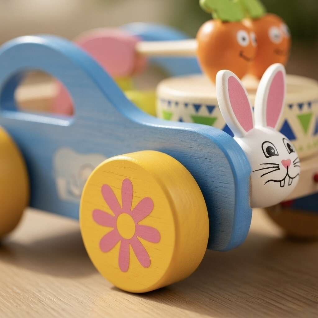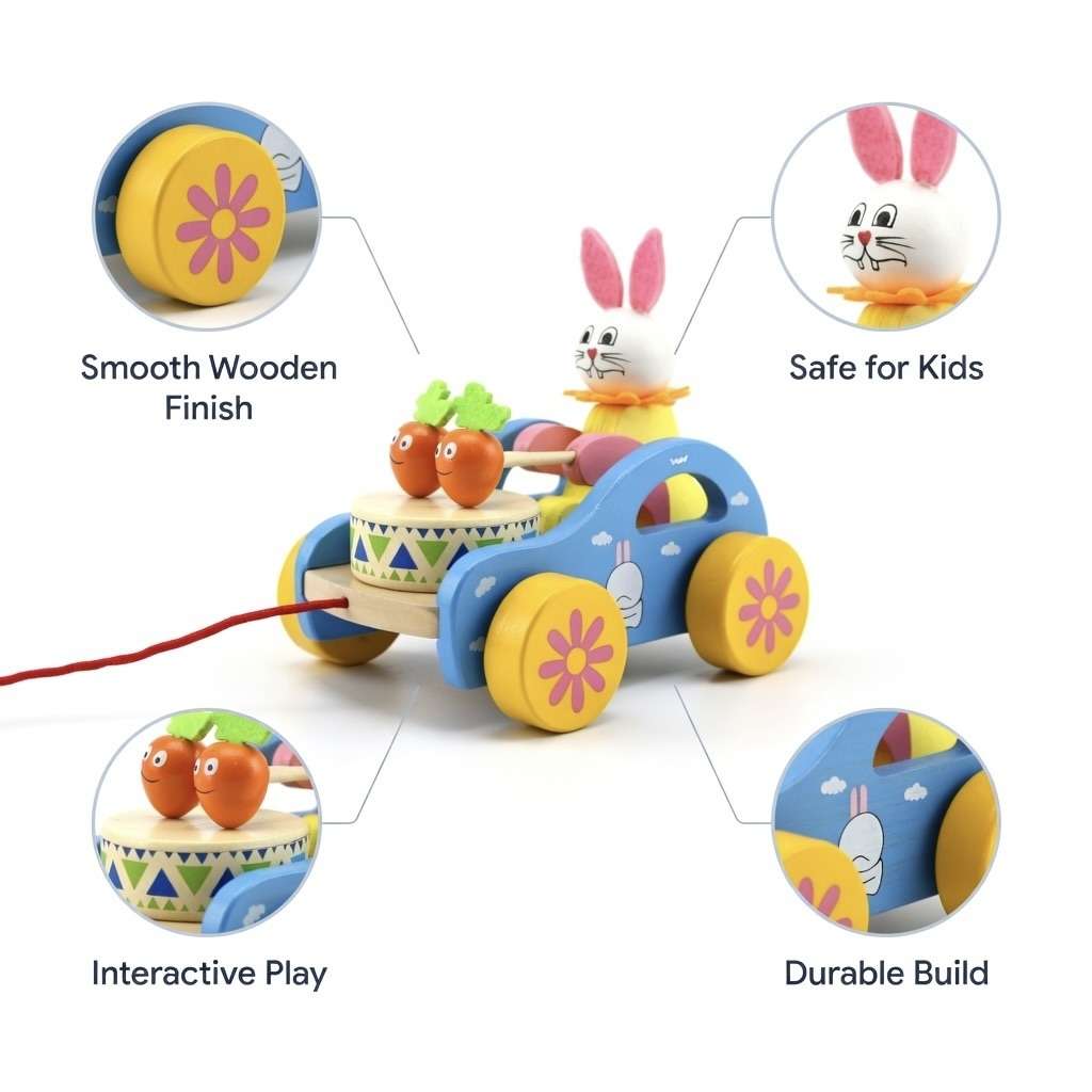 Cute wooden bunny pull toy with removable carrots & veggies on a fun cart, bright wheels, and easy-pull string — perfect for babies learning to crawl, walk, and explore!