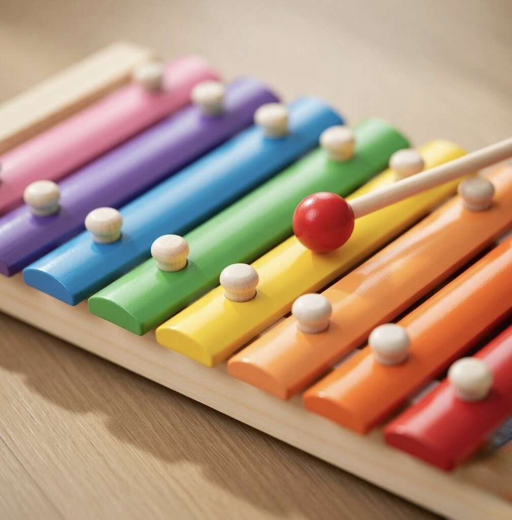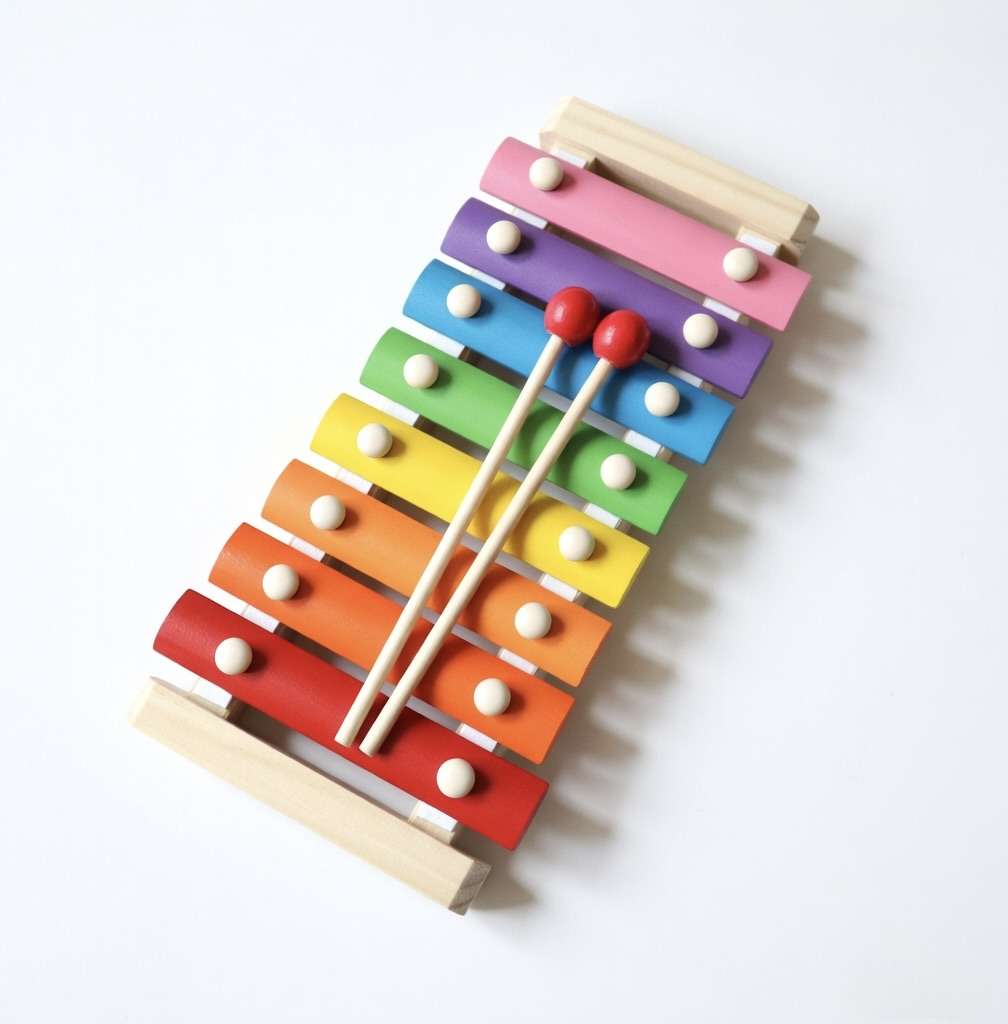 Bright rainbow wooden xylophone with 8 colorful bars, two mallets and sturdy frame — perfect for little hands to tap, make music and explore sounds!