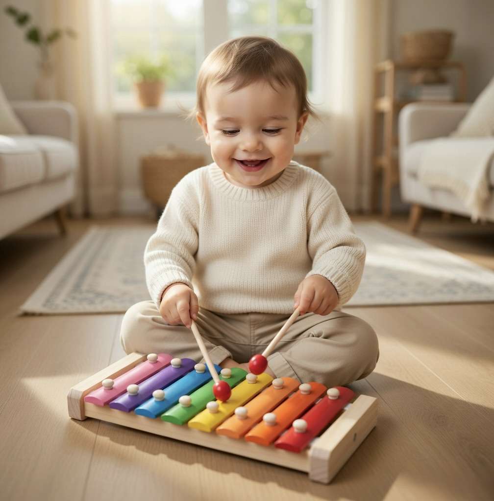 Introduce your child to the joy of music with this vibrant wooden xylophone! Features 8 precisely tuned metal bars in a beautiful rainbow sequence (red, orange, yellow, green, blue, purple, pink, and more), mounted on a natural wood frame with smooth rounded edges. Comes with two lightweight wooden mallets topped with red balls for easy grip and clear tone production. Made from high-quality natural wood and safe, non-toxic paints — durable, lightweight, and perfect for small children to hold and play. Tapping the bars creates cheerful, melodic sounds while the bright colors encourage visual learning and coordination. Ideal for sensory play, rhythm development, early music education, and creative expression. A timeless, eco-friendly musical toy that brings endless fun to toddlers and preschoolers!